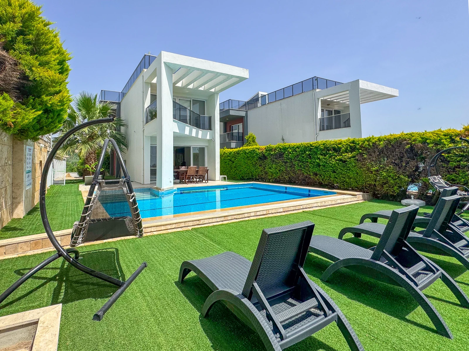 Sea-view villa with private pool in Kusadasi: Villa Limon features a glass-enclosed veranda (winter room), a large garden and bright living spaces. Two ground-floor bedrooms make it ideal for families with children and older guests. 3 bedrooms, 5 bathrooms, plus a fireplace and underfloor heating for year-round comfort.