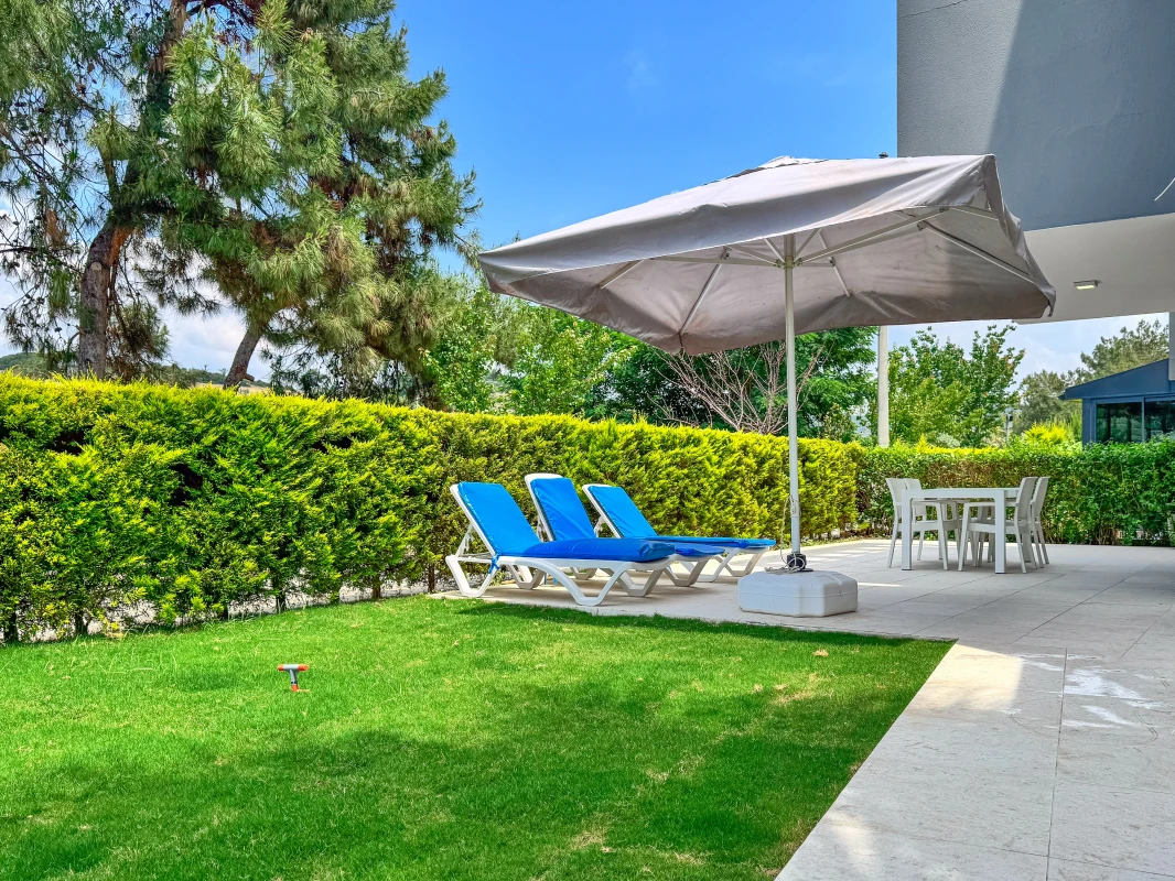 - Bahçede şezlong, şemsiye, açık hava yemek masası ve sandalyeler